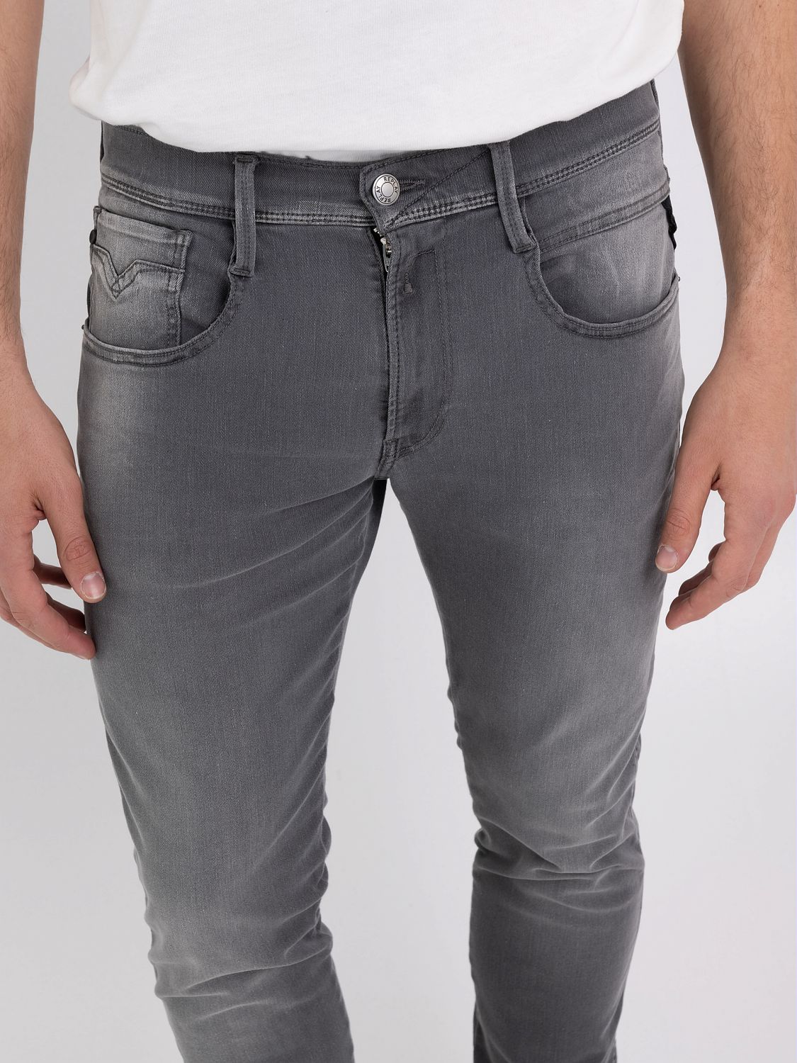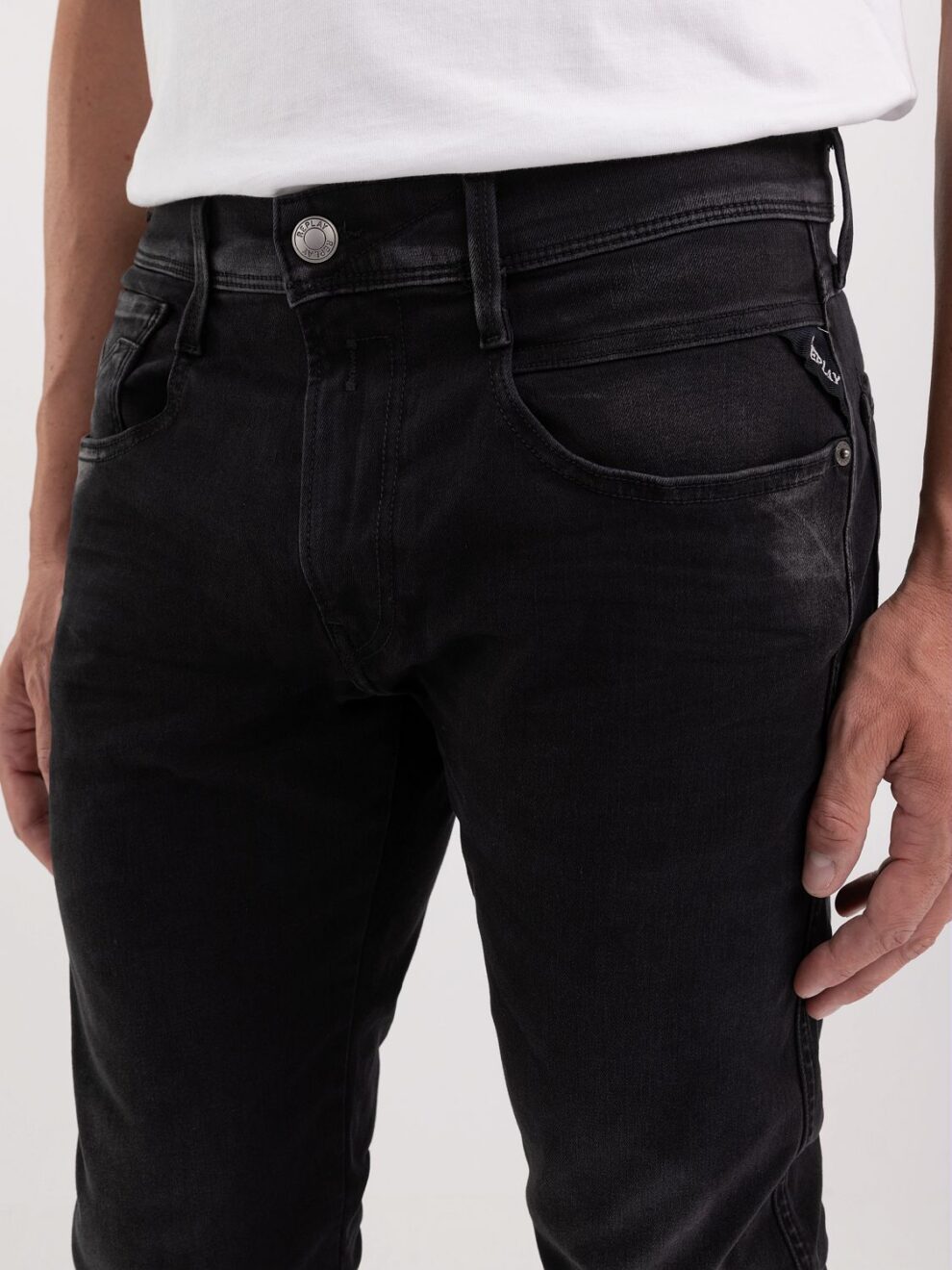 Slim fit jeans with regular fit and tapered leg for a comfort fit. With an authentic look, the garment is made of 11,5 oz 360° recycled Hyperflex reform black cotton denim with a rough wash tone. The five pocket item is characterized by the rinse treatment and by the handmade scrapings which creates contrasting colours on used areas. Zip and button fly.