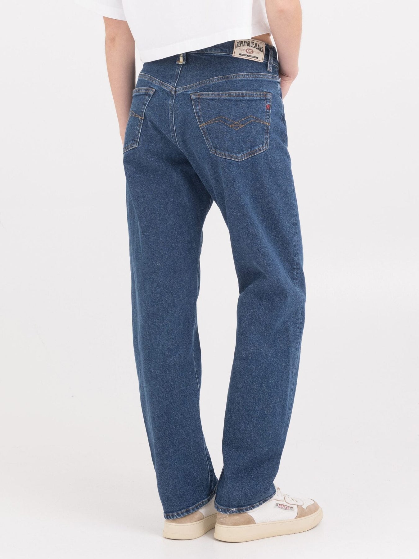 Straight fit jeans with high waist and straight leg. With a 90’s vintage look, the garment is made of 13 oz red cast indigo comfortcotton denim with a stonewashed dark wash tone. The five pocket item is refined by the belt loop at the back with customized label.The trousers are enhanced by the fastening with buttons, the first of which is visible.