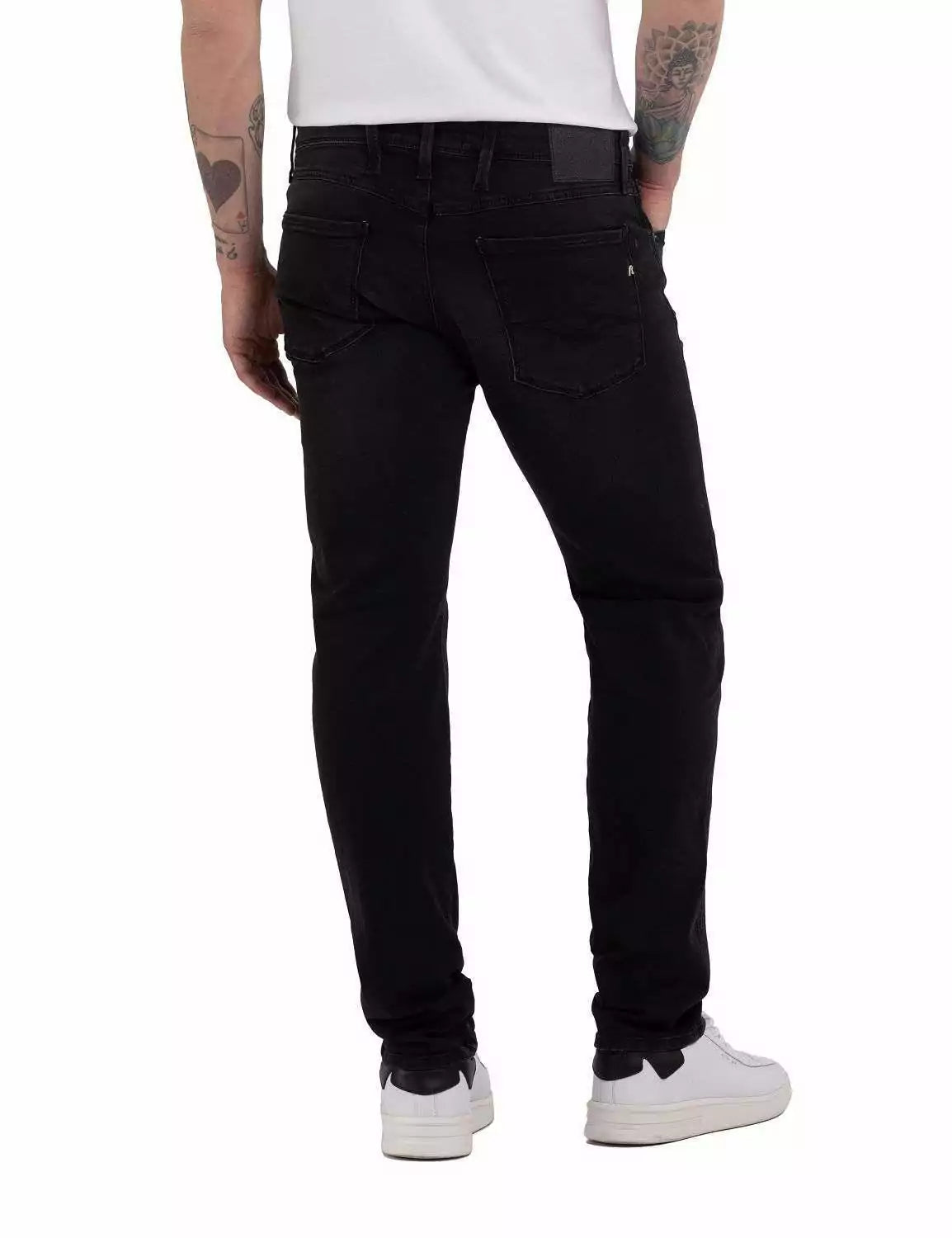 Slim fit jeans with regular waist and tapered leg for a comfort fit. With an authentic look, the garment is made of 10 oz dark indigo power stretch cotton denim with a medium wash tone. The five pocket item is characterized by the whiskers treatment and by the contrasting colours on used areas for a used effect.